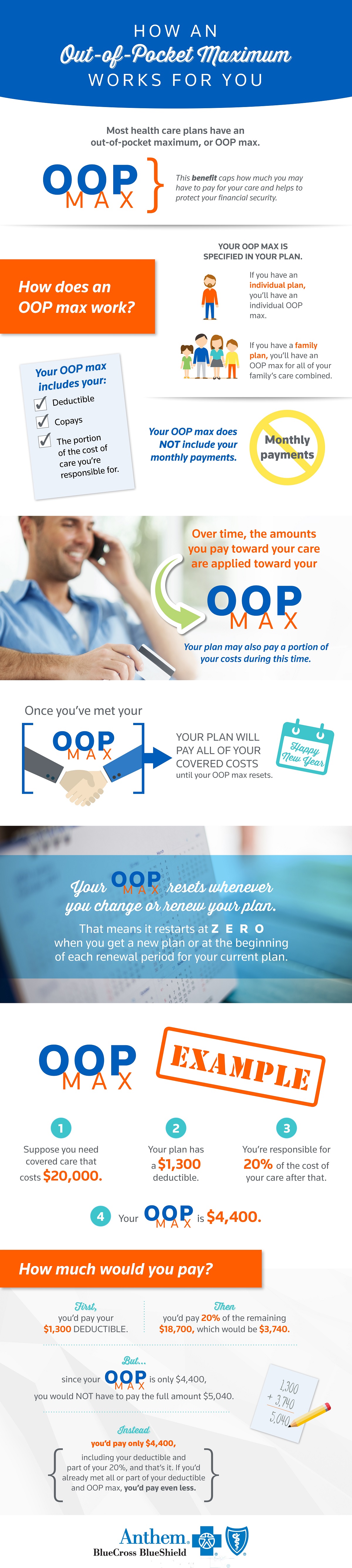 Most health care plans have an out-of-pocket maximum, or OOP max. This benefit caps how much you may have to pay for your care and helps to protect your financial security.How Does an OOP Max Work?Your OOP max is specified in your plan. If you have an individual plan, you’ll have an individual OOP max. If you have a family plan, you’ll have an OOP max for all of your family’s care combined.Your OOP max includes your: Deductible, copays, and the portion of the cost of care you’re responsible for. Your OOP max does not include your monthly payments.Over time, the amounts you pay toward your care are applied toward your OOP max. Your plan may also pay a portion of your costs during this time. Once you’ve met your OOP max, your plan will pay all of your covered costs until your OOP max resets.Your OOP max resets whenever you change or renew your plan. Most health care plans have an out-of-pocket maximum, or OOP max. This benefit caps how much you may have to pay for your care and helps to protect your financial security. That means it restarts at zero when you get a new plan or at the beginning of each renewal period for your current plan.Suppose you need covered care that costs $20,000. Your plan has a$1,300 deductible. You’re responsible for 20% of the cost of your care after that. Your OOP max is $4,400.How Much Would You Pay?First, you’d pay your $1,300 deductible. Then, you’d pay 20% of the remaining $18,700, which would be $3,740. But since your OOP max is only $4,400, you would not have to pay the full amount of $5,040. Instead you’d pay only $4,400, including your deductible and part of your 20%, and that’s it. If you’d already met all or part of your deductible and OOP max, you’d pay even less.