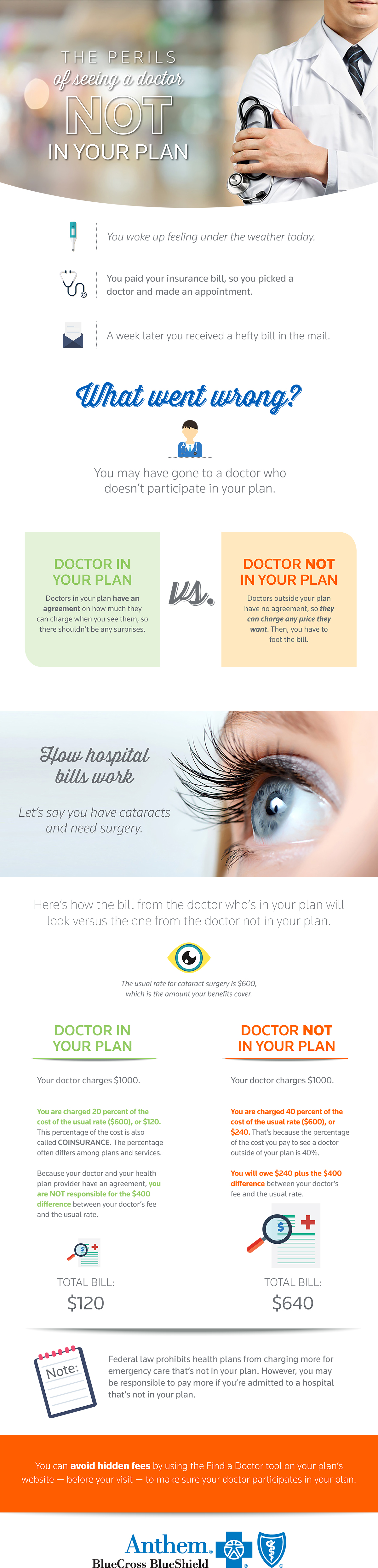 Let’s say you have cataracts and need surgery. Here’s how your bill from the doctor who’s in your plan will look versus the one from the doctor not in your plan.