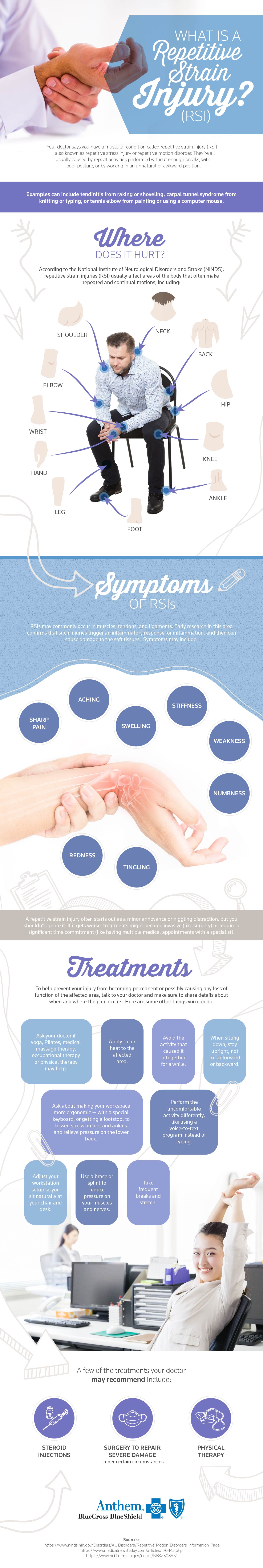 It only makes sense — if something you’re doing hurts, you should stop doing it. But there are some actions — even if they hurt — that you can’t really avoid, like typing on a keyboard at an office job or picking up an infant if you’re a new mom. If you’re feeling aches and pains when you do something over and over, you may have a repetitive stress injury (RSI). Here’s how to identify and manage these types of injuries, so you can keep living and working safely and comfortably.